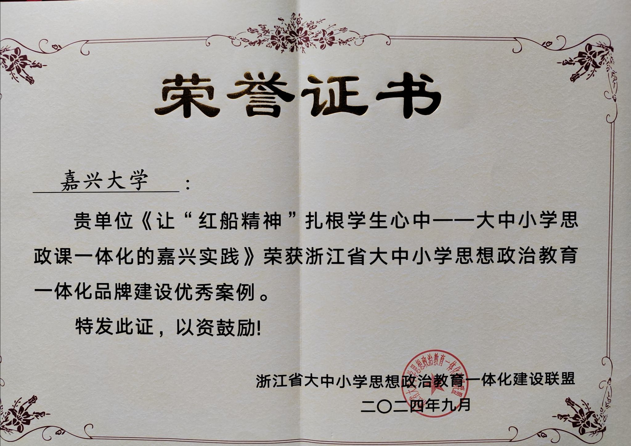 近日,国家文化安全与中国式现代化学术研讨会暨“真理的味道”大中小学思政教育一体化地方创新实践论坛在台州举行,会上由我校“嘉兴市大中小学思政课一体化研究中心”申报的案例《让“红船精神”扎根学生心中--大中小学思政课一体化的嘉兴实践》荣获了浙江省大中小学思想政治教育一体化品牌建设优秀案例。