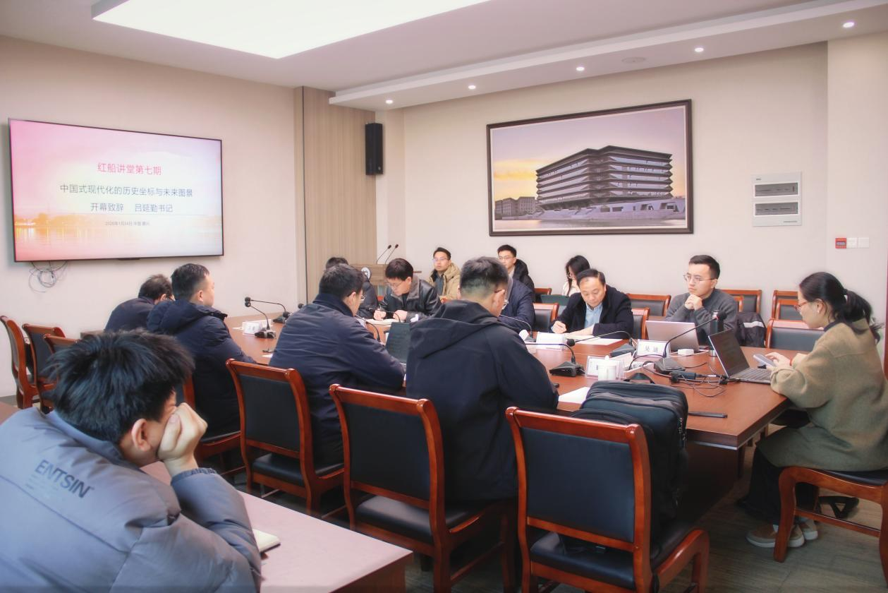 (中共党史党建学院)第七期红船讲堂暨青年教师首届红船青研坊在厚德楼350会议室顺利举办。本次活动以“世界变局与文明展望:中国式现代化的历史坐标与未来图景”为主题,汇聚复旦大学、上海交通大学、上海政法学院、湖州师范大学等多所高校专家学者,与我校师生齐聚一堂,跨学科研讨中国式现代化相关前沿议题。校原党委副书记吕延勤,学院副书记、副院长罗理章,学术副院长余玉湖等出席,本次活动由刘媛媛博士主持。