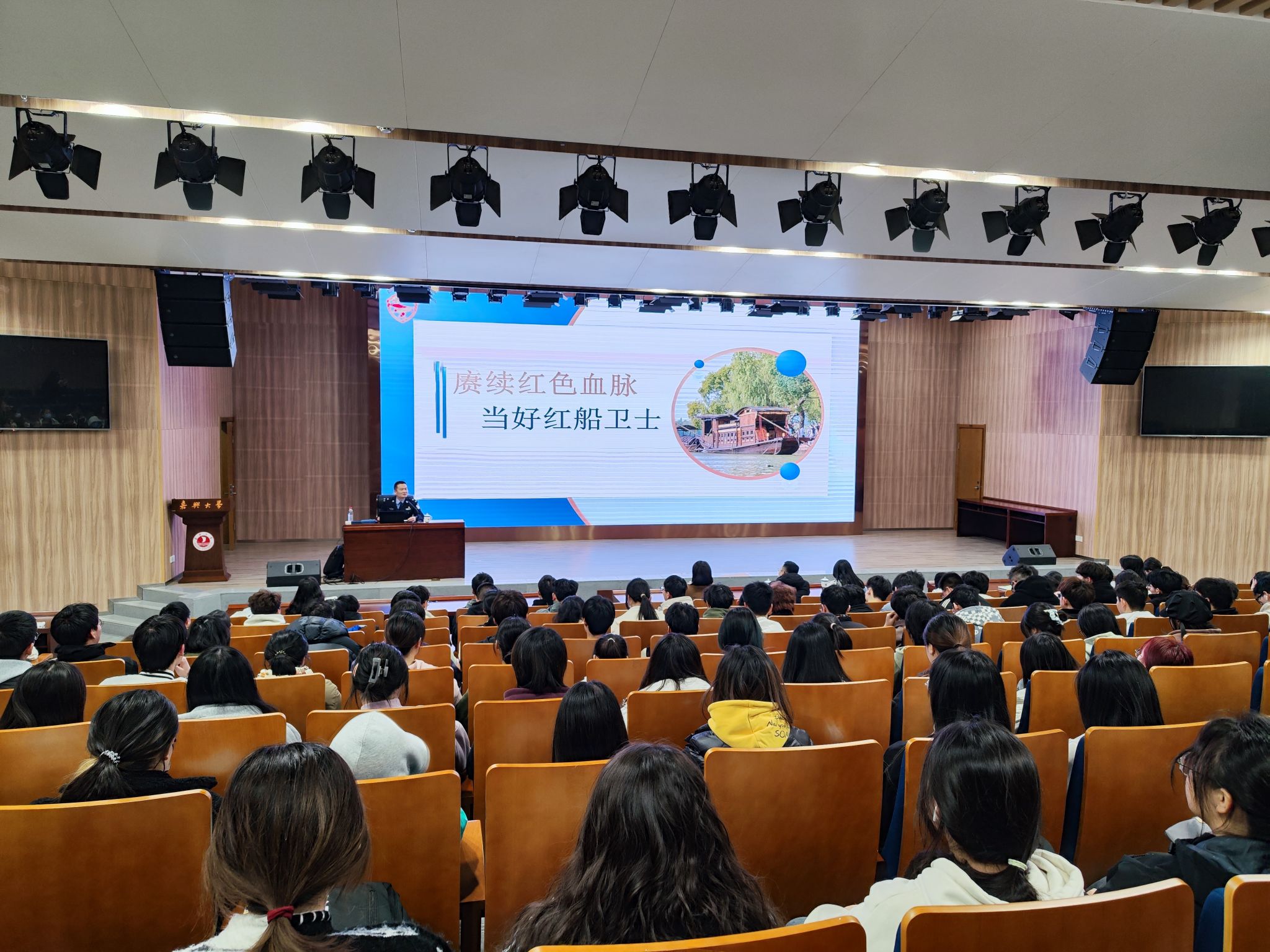 2024312日下午,为纪念习近平总书记“3·18”思政课教师座谈会讲话发表五周年,由偷拍自拍 、偷拍自拍 红船精神传承名师工作室、偷拍自拍 德法教研室承办的“劳模进课堂”系列讲座——“赓续红色血脉 当好红船卫士”在校图书馆一楼报告厅举行,线下160名师生和线上1000多名学生,聆听了讲座。