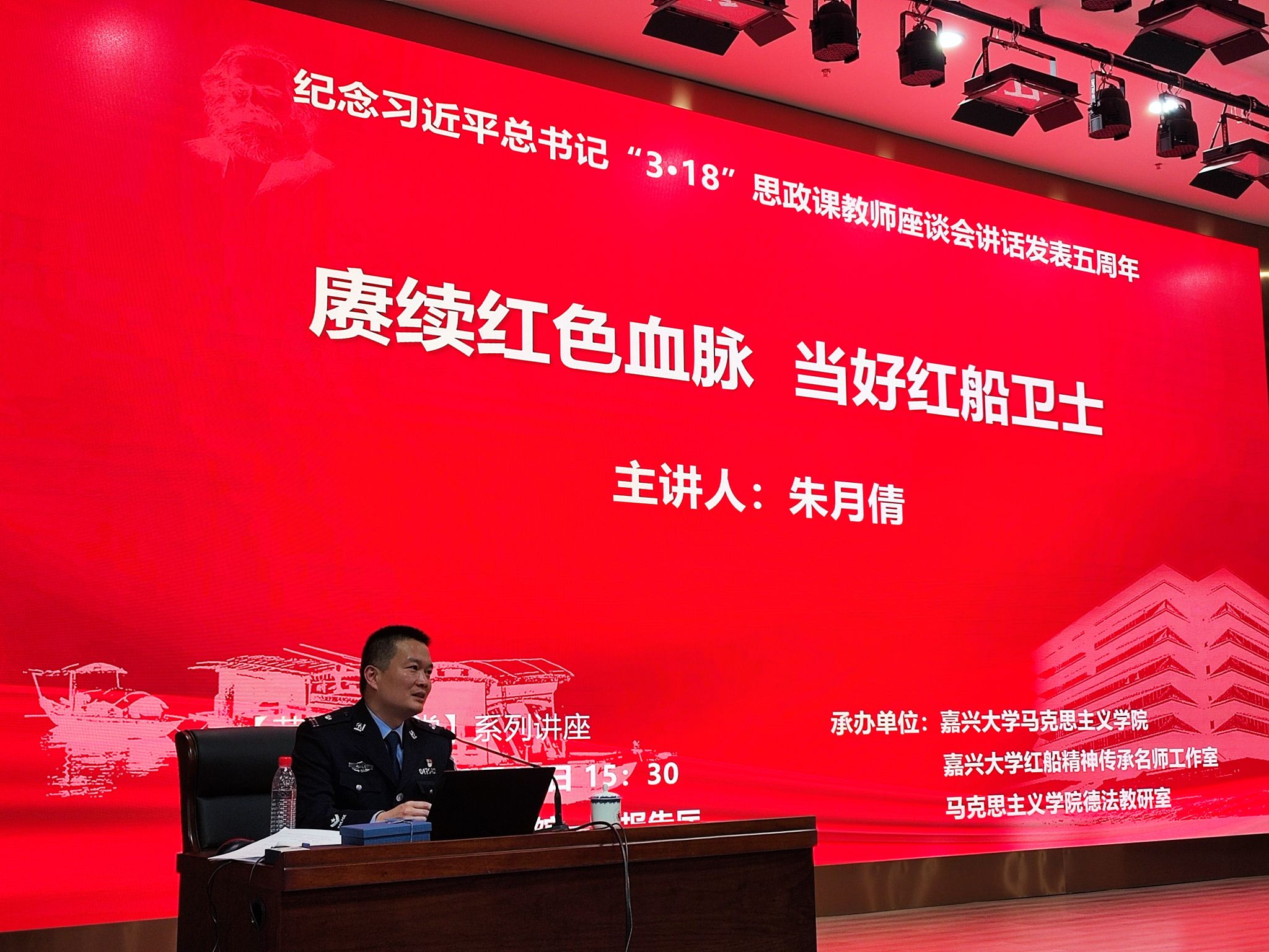 朱月倩是嘉兴市公安局南湖分局七一派出所教导员、二级警长,曾荣立个人三等功2次、嘉奖7次,获评区十佳民警、区十佳红船卫士、区最美退役军人。七一派出所负责中共“一大”纪念船(红船)、嘉兴市行政中心、南湖革命纪念馆、南湖景区等重点单位和重要区域的治安派出所,获评“全国优秀公安基层单位”(2022),省市级荣誉多项。这次朱警长代表七一派出所先进集体为我校师生讲了一堂特别的思政课。