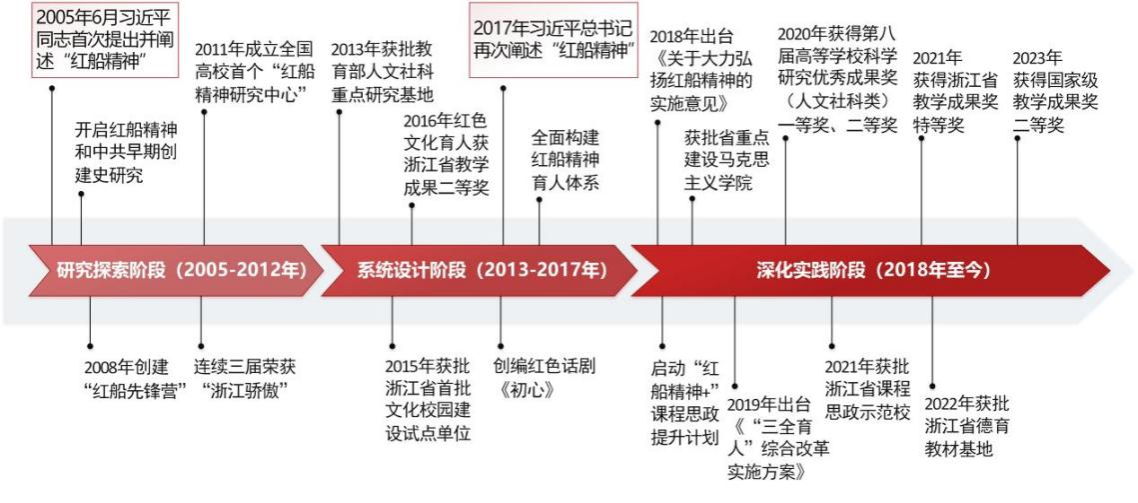 构建红船精神育人模式的主线。中心研究团队多年来,围绕“传承红色基因、培育时代新人”的育人主题,沿着“学科支撑、课堂主导、实践渗透、文化浸润、全员协同”的路径不断前行,助力学校各项育人工作实现同向同行、融合贯通。